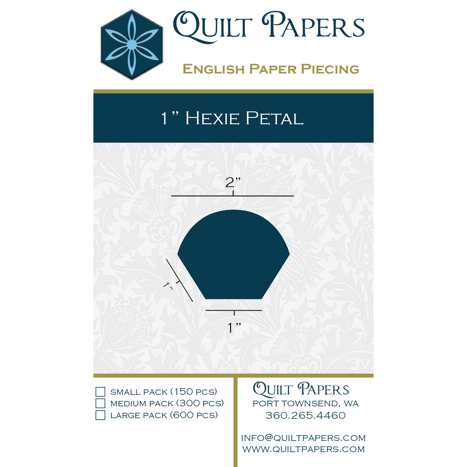 1" hexagon paper pieces for English Paper Piecing in three package sizes- small, medium, and large.