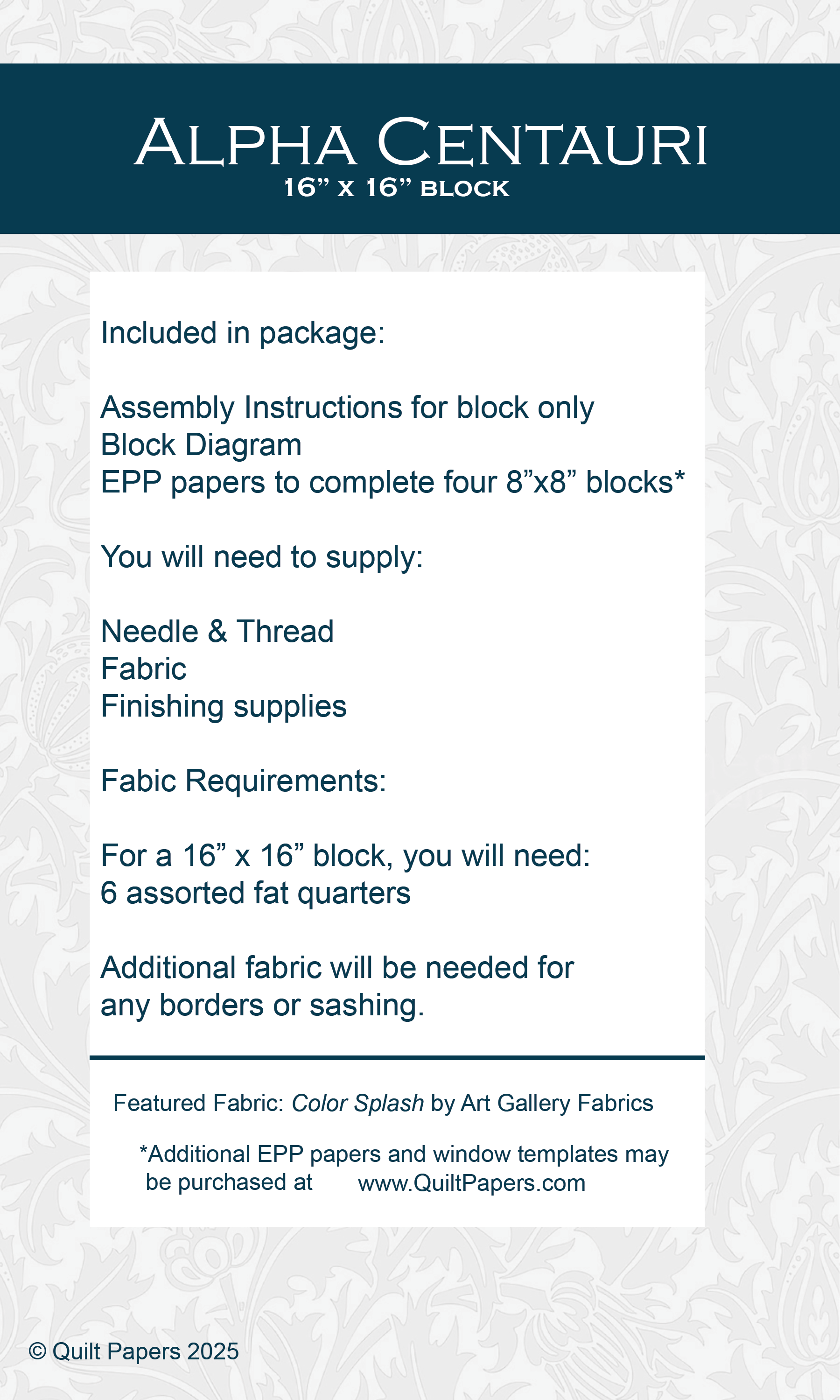 This EPP Project contains the papers, eco-friendly window templates with 3/8" seam, and assembly instructions to complete this colorful swirling octagon quilt. The quilt block is 16"x16" and you can add borders to complete a wall hanging or to highlight in a picture frame.